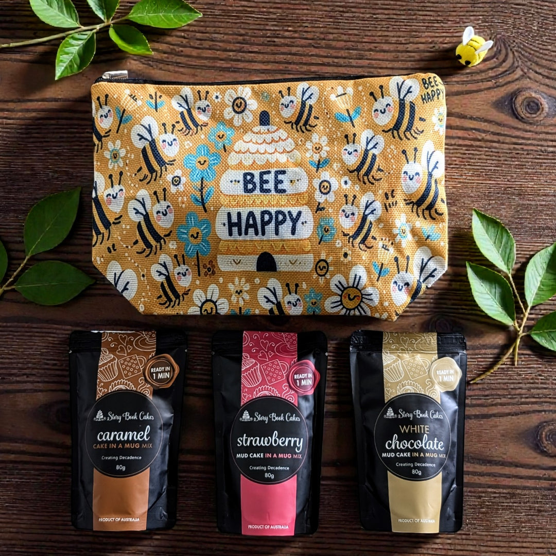 Bee Happy Zip Up Gift Bag Set - 3 x Mud Cake in a Mugs, Pick your own flavours